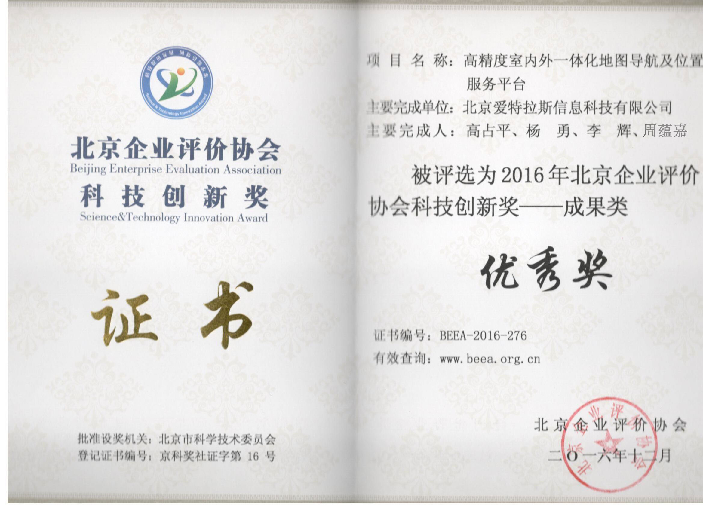近日,我公司產(chǎn)品高精度室內(nèi)外一體化地圖導(dǎo)航及位置服務(wù)平臺(tái)榮獲2016年度中國(guó)企業(yè)評(píng)價(jià)協(xié)會(huì)科技創(chuàng)新獎(jiǎng)——成果類獎(jiǎng)項(xiàng)。