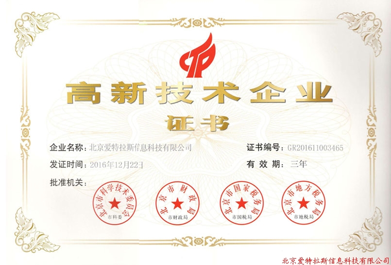 喜訊!2016年12月22日,北京愛特拉斯信息科技有限公司被評(píng)為國家高新技術(shù)企業(yè)。高新技術(shù)企業(yè)屬于國家重點(diǎn)支持的具有高成長性的創(chuàng)新型企業(yè),具有潛在的科技和創(chuàng)新價(jià)值。獲得高新技術(shù)企業(yè)認(rèn)證,表明公司具備較強(qiáng)的創(chuàng)新意識(shí)、較高的市場開拓能力和經(jīng)營管理水平,大大提升公司的品牌價(jià)值。