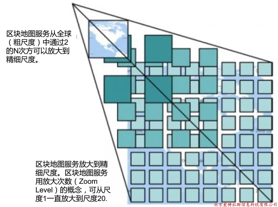 區(qū)塊地圖服務可以從全球低分辨率的衛(wèi)星影像放大到高尺度的衛(wèi)星影像。