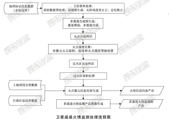 利用高頻次氣象衛(wèi)星進行火點判識,主要是遙感分析的手段判識火點像元的經(jīng)緯度、所在位置的行政區(qū)劃、土地利用類型、火點判識的可信度(火點、可能火點、云區(qū)火點等)等。