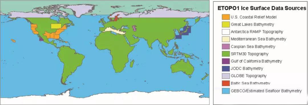NGDC于2001年、2006年陸續(xù)發(fā)布了ETOPO2的兩個(gè)版本,提供5弧分經(jīng)緯度網(wǎng)格的陸地和海洋高程;2008年8月NGDC發(fā)布了ETOPO1版本,提供全球范圍1弧分經(jīng)緯度網(wǎng)格分辨率的陸渡和海洋高程,分為Ice Surface和Bedrock兩個(gè)版本,兩個(gè)版本差別在于處理南極洲和Greenland區(qū)域數(shù)據(jù)時(shí),Ice Surface給出的是加上冰蓋層之后的高程,Bedrock給出的是巖床的高程。ETOPO1是目前可以免費(fèi)使用的唯一提供海洋高程的全球DEM數(shù)據(jù)。
