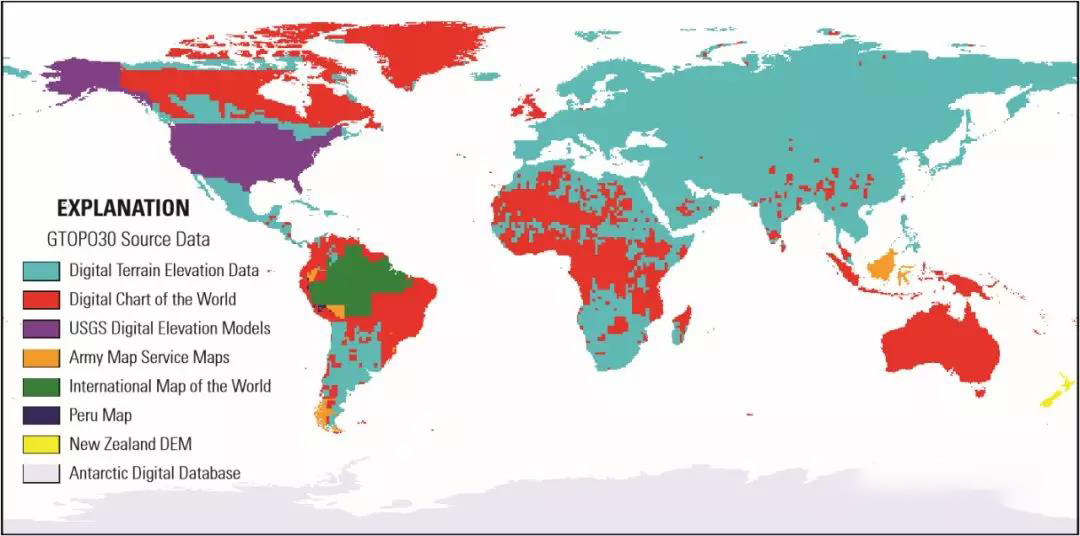 為了滿足EOS和其他全球變化研究項(xiàng)目的需求,20世紀(jì)90年代末(1996年完成),美國(guó)地質(zhì)調(diào)查局(United States Geological Survey,簡(jiǎn)稱USGS)開(kāi)發(fā)了全球1Km DEM產(chǎn)品GTOPO30,相當(dāng)于30弧秒經(jīng)緯度網(wǎng)格分辨率。GTOPO30同樣采用對(duì)已有制圖數(shù)據(jù)重新編制的生產(chǎn)方法,共8個(gè)數(shù)據(jù)源,由8個(gè)機(jī)構(gòu)參與數(shù)據(jù)提供、技術(shù)及資金支持,經(jīng)過(guò)三年的合作最終完成。