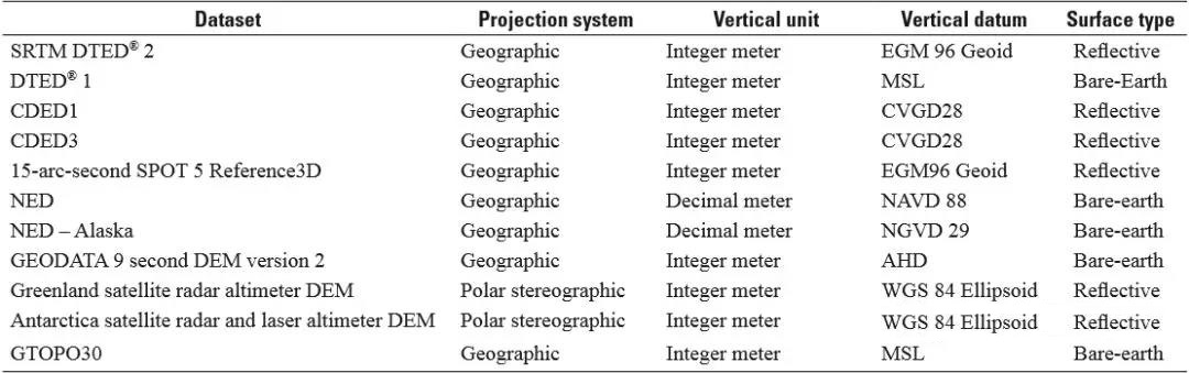 GMTED2010的數(shù)據(jù)源具有多分辨率、多基準(zhǔn)面、多坐標(biāo)系的特征,NASA和NGA在制作GMTED2010產(chǎn)品時(shí),除了采用多分辨率外,還建立了包括最小高程、最大高程、平均高程、中間高程、高程標(biāo)準(zhǔn)偏差、系統(tǒng)統(tǒng)計(jì)采樣、增強(qiáng)特征曲線的七種高程產(chǎn)品。