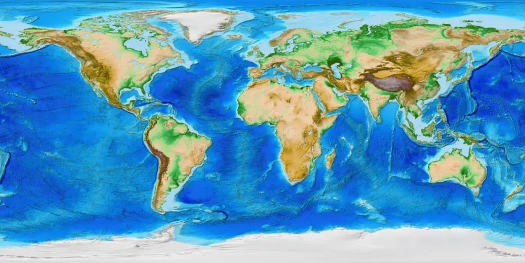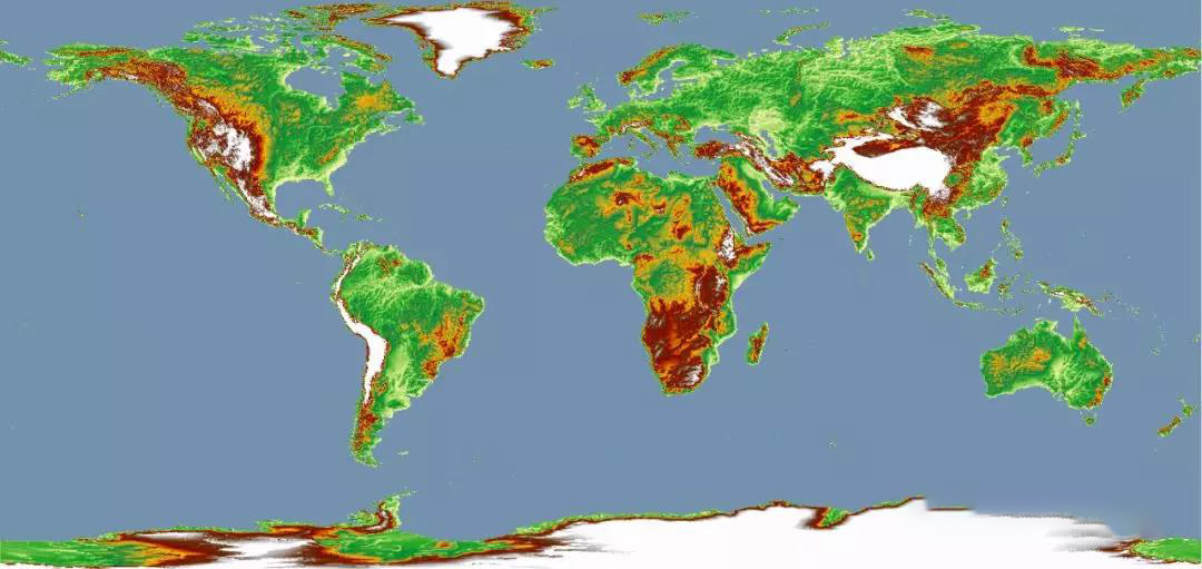 隨著全球各領(lǐng)域研究對(duì)高分辨率DEM數(shù)據(jù)的需求不斷增強(qiáng),同時(shí)新的高程數(shù)據(jù)獲取技術(shù)不斷涌現(xiàn),USGS和NGA合作,十年磨一劍,于2010年共同推出了全球多分辨率地形高程數(shù)據(jù)(Global Multi-resolution Terrain Elevation Data,簡(jiǎn)稱GMTED2010),在全球陸地區(qū)域提供30弧秒、15弧秒、7.5弧秒三種分辨率DEM數(shù)據(jù)。(在格陵蘭島和南極洲只提供30弧秒分辨率DEM數(shù)據(jù),其他陸地區(qū)域均提供相當(dāng)于1Km、500m、250m分辨率的DEM數(shù)據(jù)),下圖是GMTED2010全球30弧秒分辨率平均高程數(shù)據(jù)(-430/8625米)。