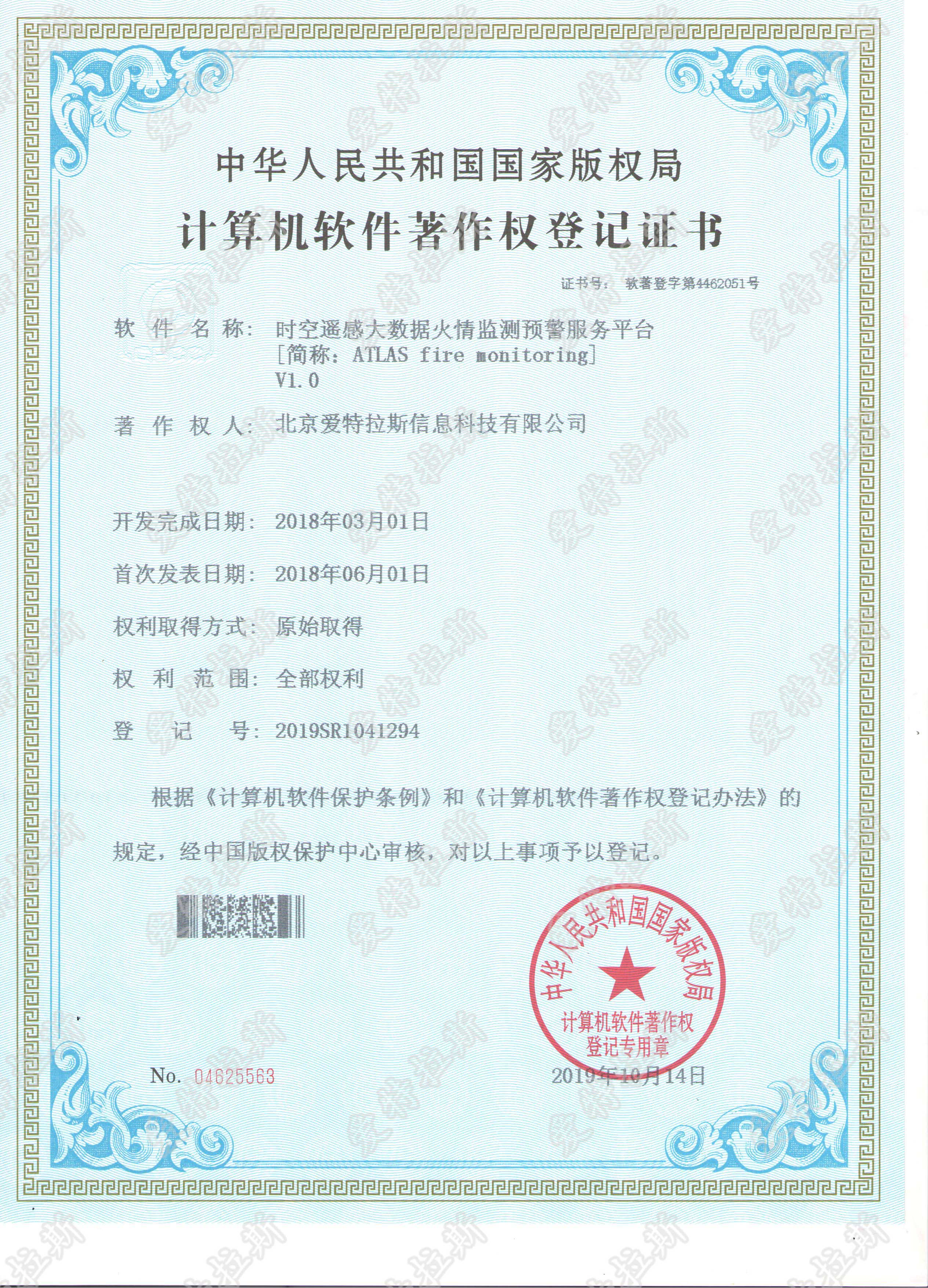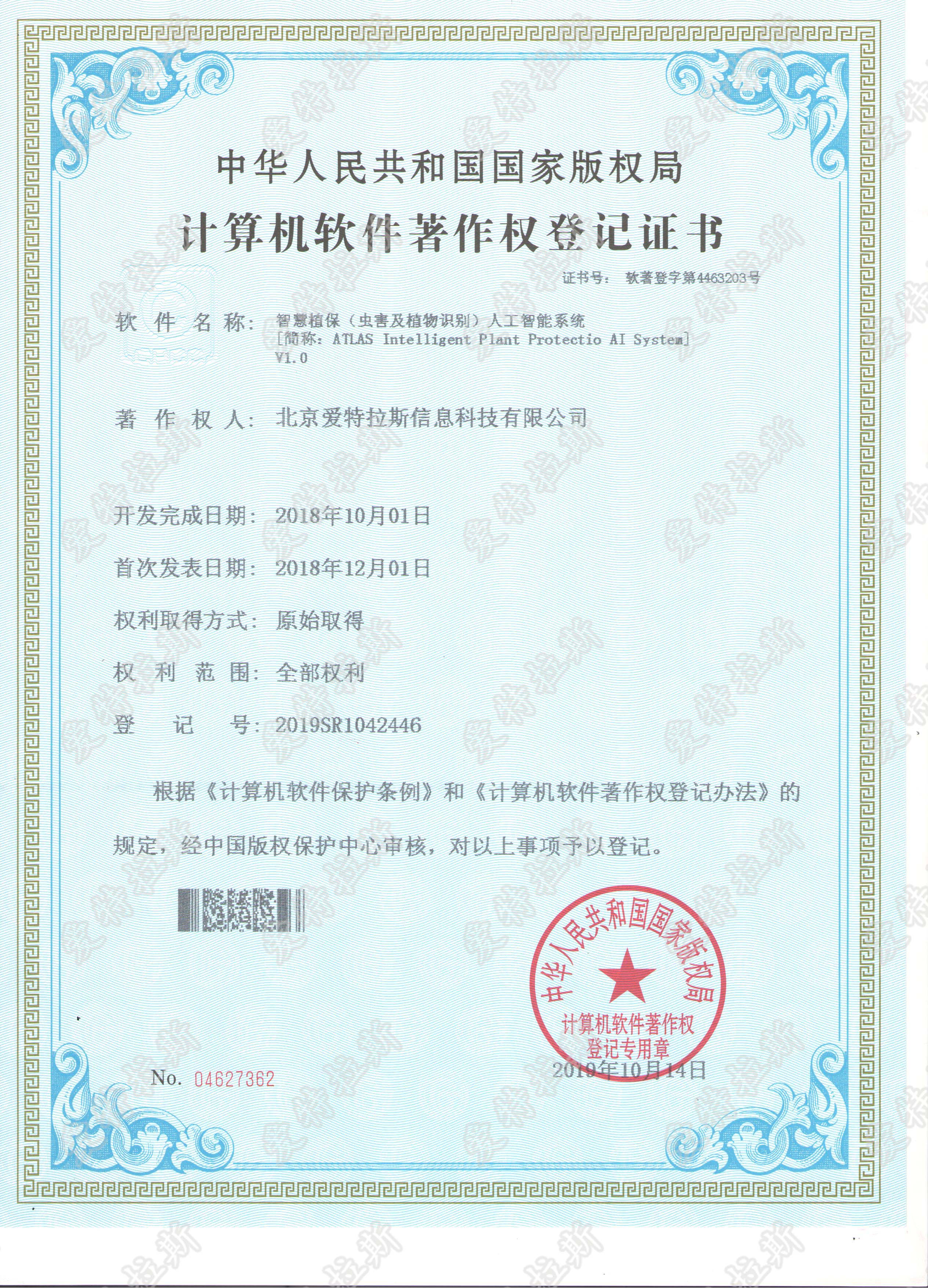 近日,北京愛(ài)特拉斯信息科技有限公司先后獲得了《農(nóng)作物四情(苗青、災(zāi)情、墑情、病蟲(chóng)害)監(jiān)測(cè)服務(wù)平臺(tái)》、《智慧環(huán)境(水)衛(wèi)星遙感監(jiān)測(cè)服務(wù)平臺(tái)》、《智慧植保(蟲(chóng)害及植物識(shí)別)人工智能系統(tǒng)》、《時(shí)空遙感大數(shù)據(jù)火情監(jiān)測(cè)預(yù)警服務(wù)平臺(tái)》等四項(xiàng)軟件著作權(quán)。