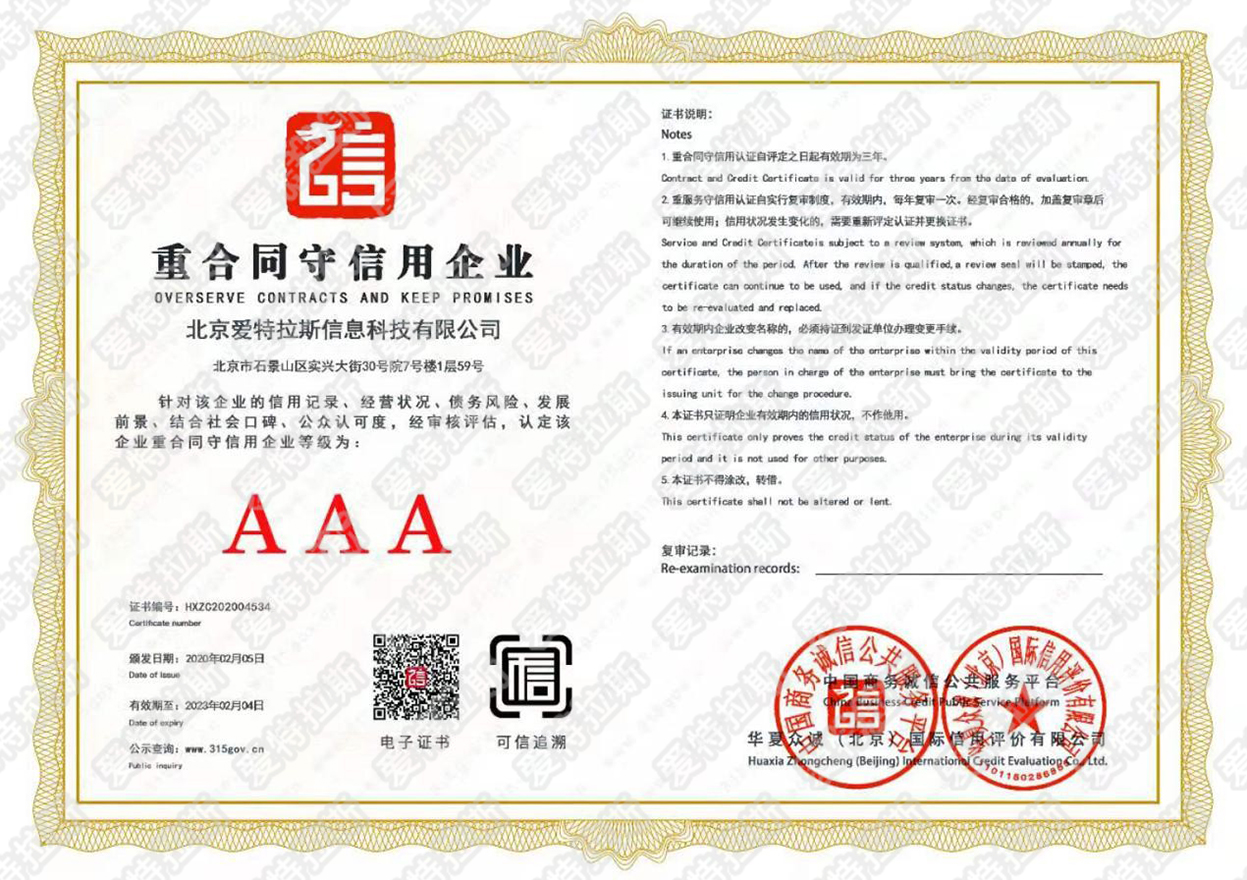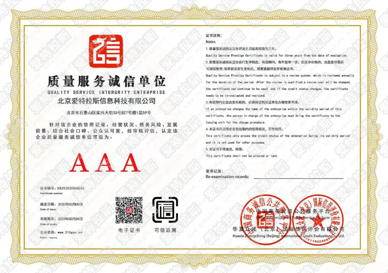 我司在服務(wù)守信、質(zhì)量守信、合同守信等方面一直秉承著嚴(yán)律己身的精神,盡職盡責(zé)的服務(wù)于廣大客戶,而此次3A體系認證的通過就是廣大客戶對我司實力以及信譽上的一種認可,也是我司在服務(wù)之路上的一種重大收獲,我司也會一直懷抱著不驕不躁的態(tài)度,將這種良好精神保持下去。