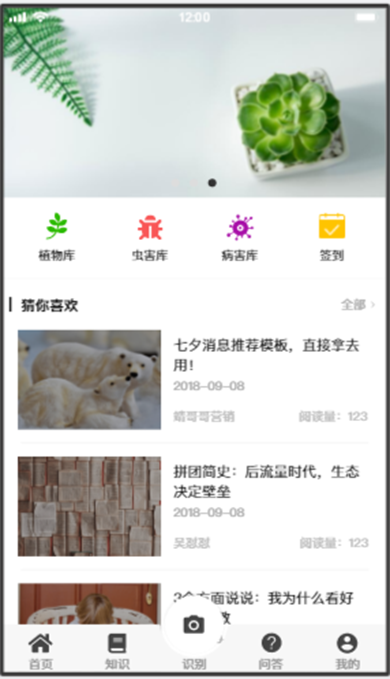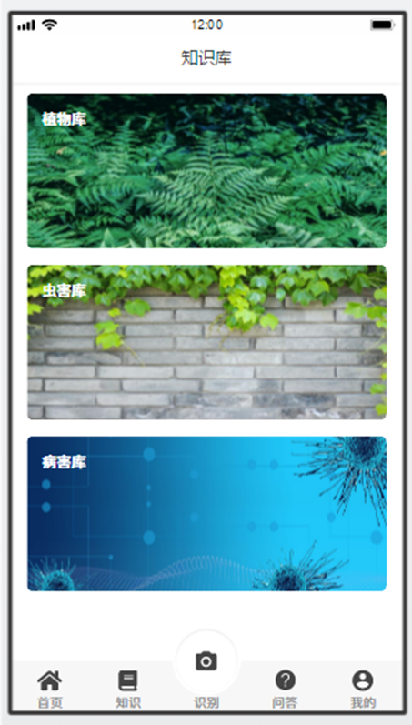 植物庫、蟲害庫、病害庫、簽到四個(gè)快捷入口。點(diǎn)擊植物庫快捷入口,跳轉(zhuǎn)到植物庫一級(jí)界面。