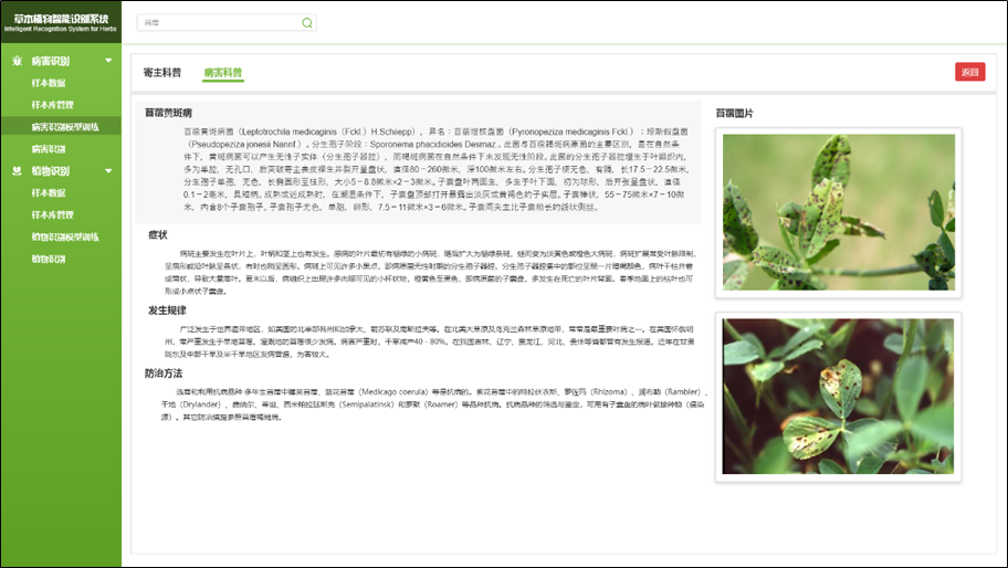 苜蓿病害診斷:基于上傳的數(shù)碼照片給出相應(yīng)病害類型及防治措施。