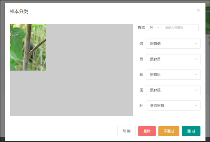 點(diǎn)擊取消關(guān)閉審核界面;可對(duì)圖片進(jìn)行刪除和審核操作。對(duì)于符合條件的圖片(植物可在右側(cè)下拉框中選取對(duì)應(yīng)的綱、目、科、屬、種),點(diǎn)擊通過。