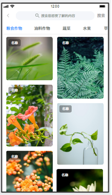 點(diǎn)擊植物庫圖片,進(jìn)入植物庫分類界面,將植物分為糧食作物、油料作物、蔬菜、水果、草植等類別,還支持關(guān)鍵字查詢。