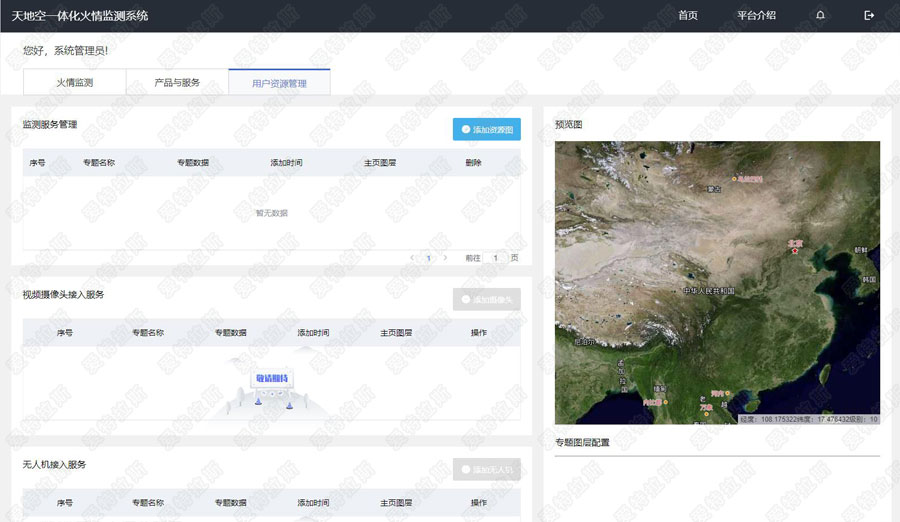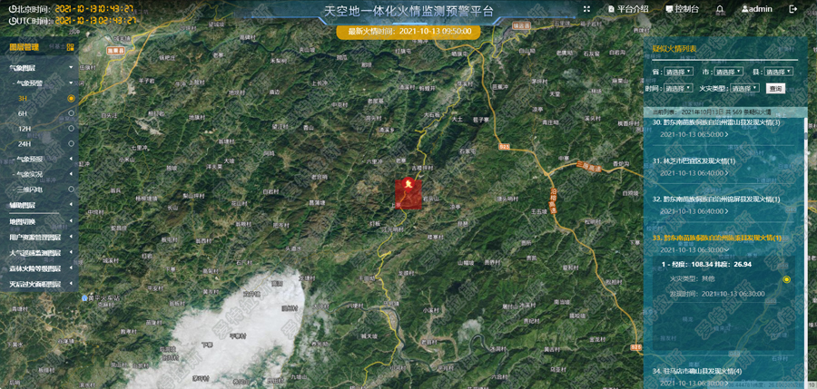本平臺(tái)根據(jù) 《“十四五”林業(yè)草原保護(hù)發(fā)展規(guī)劃綱要》中的“林業(yè)生態(tài)監(jiān)測”需求,結(jié)合使用靜止衛(wèi)星打造出“天空地一體化火情監(jiān)測預(yù)警平臺(tái)”,下圖為平臺(tái)主要界面。