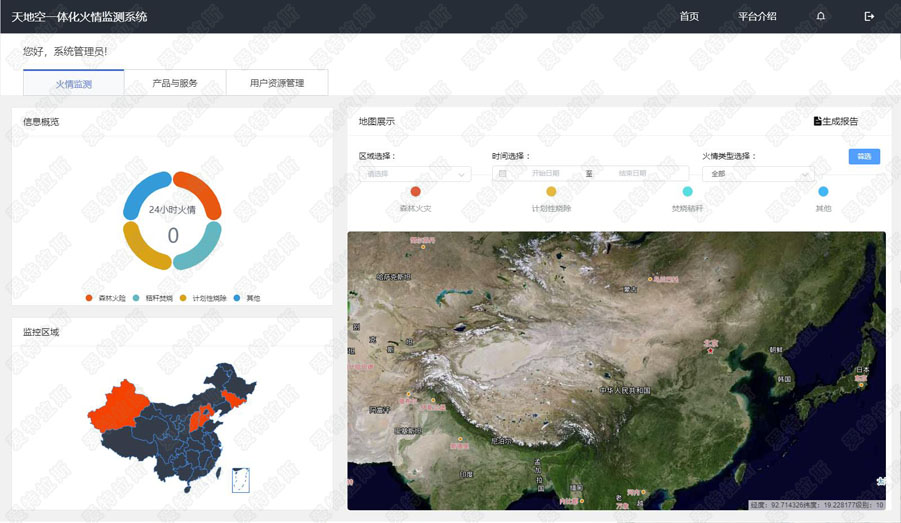 天空地一體化火情監(jiān)測預(yù)警平臺(tái)擁有高時(shí)效頻次的遙感衛(wèi)星智能識(shí)別地面高溫火點(diǎn)工具,具有自主監(jiān)測識(shí)別的能力,并且支持?jǐn)?shù)據(jù)資產(chǎn)化的管理。可為林業(yè)、環(huán)保、應(yīng)急等行業(yè)用戶提供野外疑似火點(diǎn)的準(zhǔn)實(shí)時(shí)預(yù)警服務(wù),可對(duì)災(zāi)前火險(xiǎn)預(yù)警、災(zāi)中精準(zhǔn)掌握、災(zāi)后燃燒評(píng)估三個(gè)階段全方面掌握。同時(shí)系統(tǒng)可以集成無人機(jī)、移動(dòng)巡檢等設(shè)備,從而提升當(dāng)?shù)鼗鹎榈膽?yīng)急處置。本平臺(tái)免費(fèi)提供50分鐘延遲監(jiān)測。
