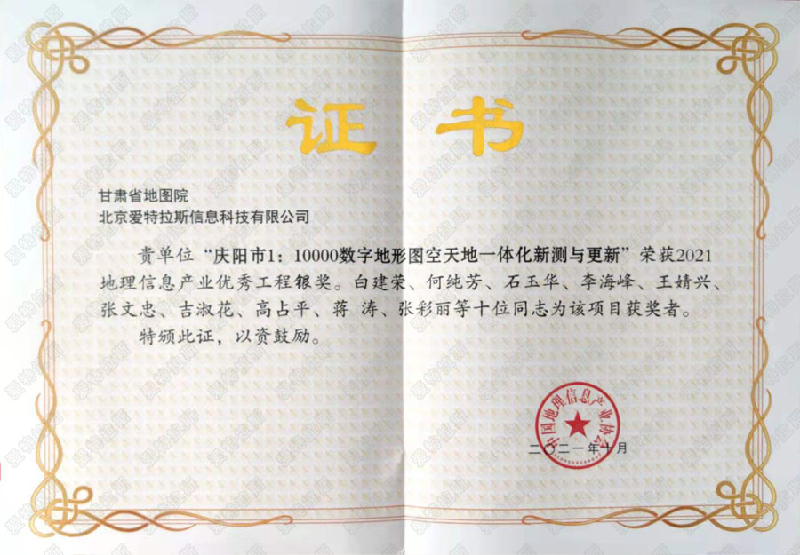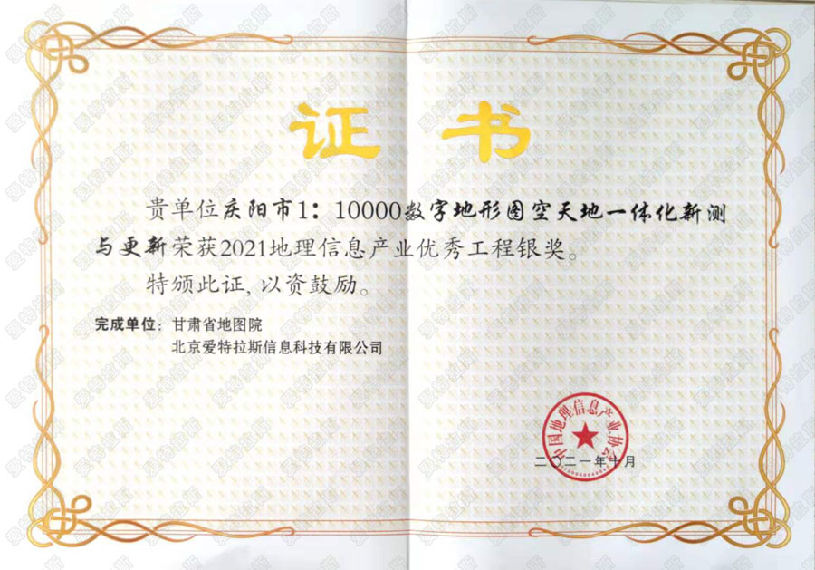 二零二一年十月,經(jīng)過(guò)中國(guó)地理信息產(chǎn)業(yè)協(xié)會(huì)嚴(yán)格評(píng)選,我公司參與項(xiàng)目《慶陽(yáng)市1:10000數(shù)字地形圖空天地一體化新測(cè)與更新》項(xiàng)目榮獲2021地理信息產(chǎn)業(yè)優(yōu)秀工程銀獎(jiǎng),我司總經(jīng)理為該項(xiàng)目獲獎(jiǎng)?wù)咧弧?/span>