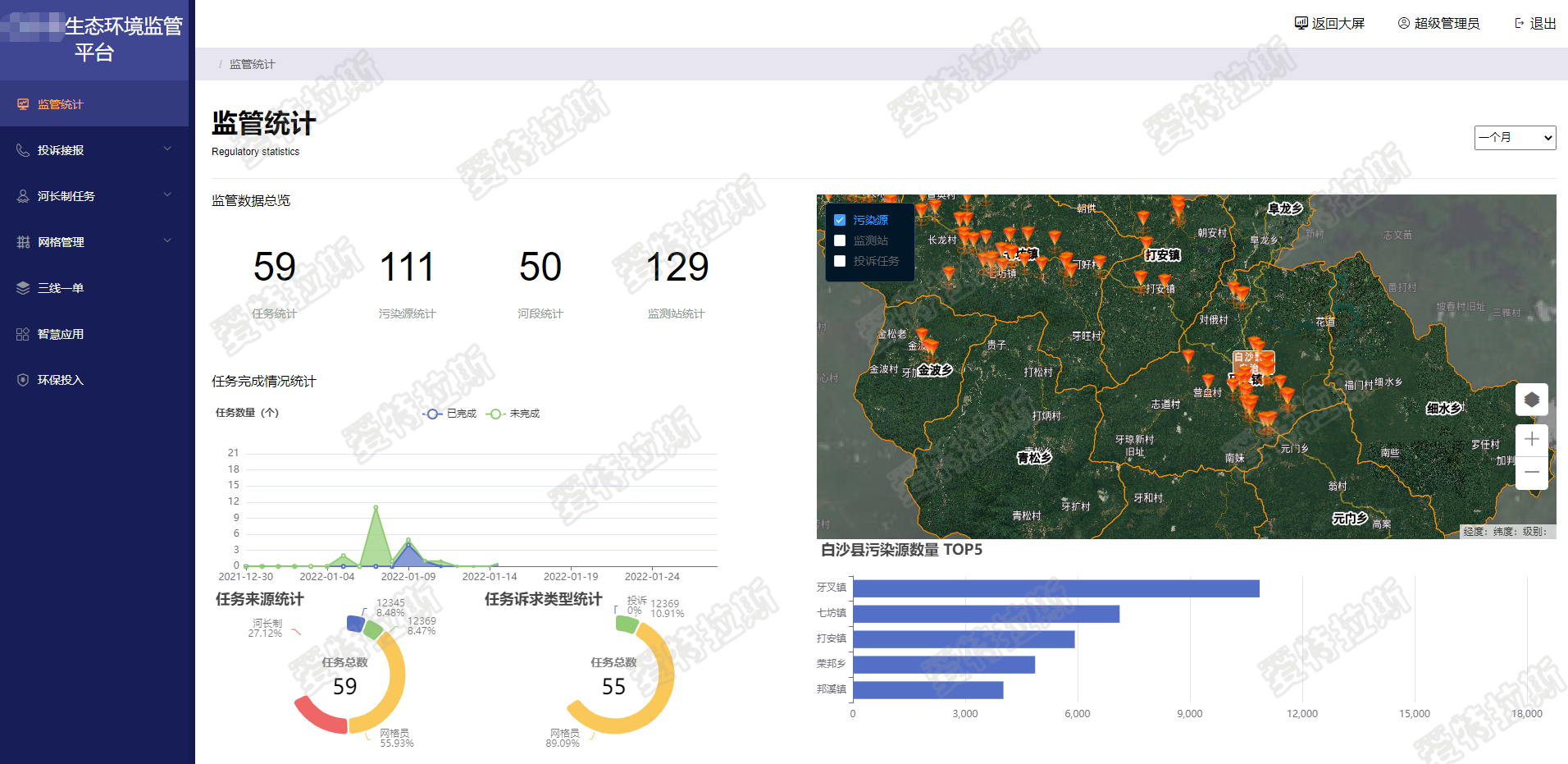 對資源整合分析實現生態(tài)環(huán)境一張圖。通過監(jiān)測提供的數據可以在此頁面提供可視化的生態(tài)環(huán)境指標、列表、統(tǒng)計圖等,并且可以在地圖上顯示出污染源、水、大氣、固廢、噪音農村污水的具體點位和詳情描述。通過監(jiān)管提供的數據可以在此頁面展示12345、12369、河長、網格的任務數和完成率和達標率。 |