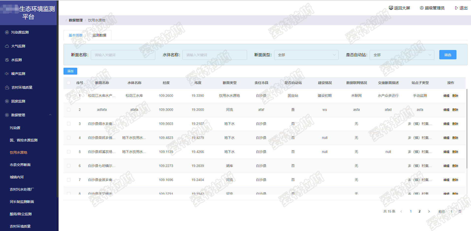 通過監(jiān)測站和手工監(jiān)測提供的數據實現分析統(tǒng)計數據管理的這么一個系統(tǒng)。數據管理也可以稱為數據庫主要是對收錄的數據去進行一個區(qū)分編輯管理,整個環(huán)境的統(tǒng)計查詢分析提供一份明確的數據。污染源、大氣、水、噪音、農村環(huán)境質量、固廢六大監(jiān)測通過數據管理提供的數據可以在地圖中呈現出可視化的展示,可以對其進行查詢篩選,點擊地圖中的標識點位會出現詳情框,在詳情框里會展示出該點位的具體詳情等操作。 |