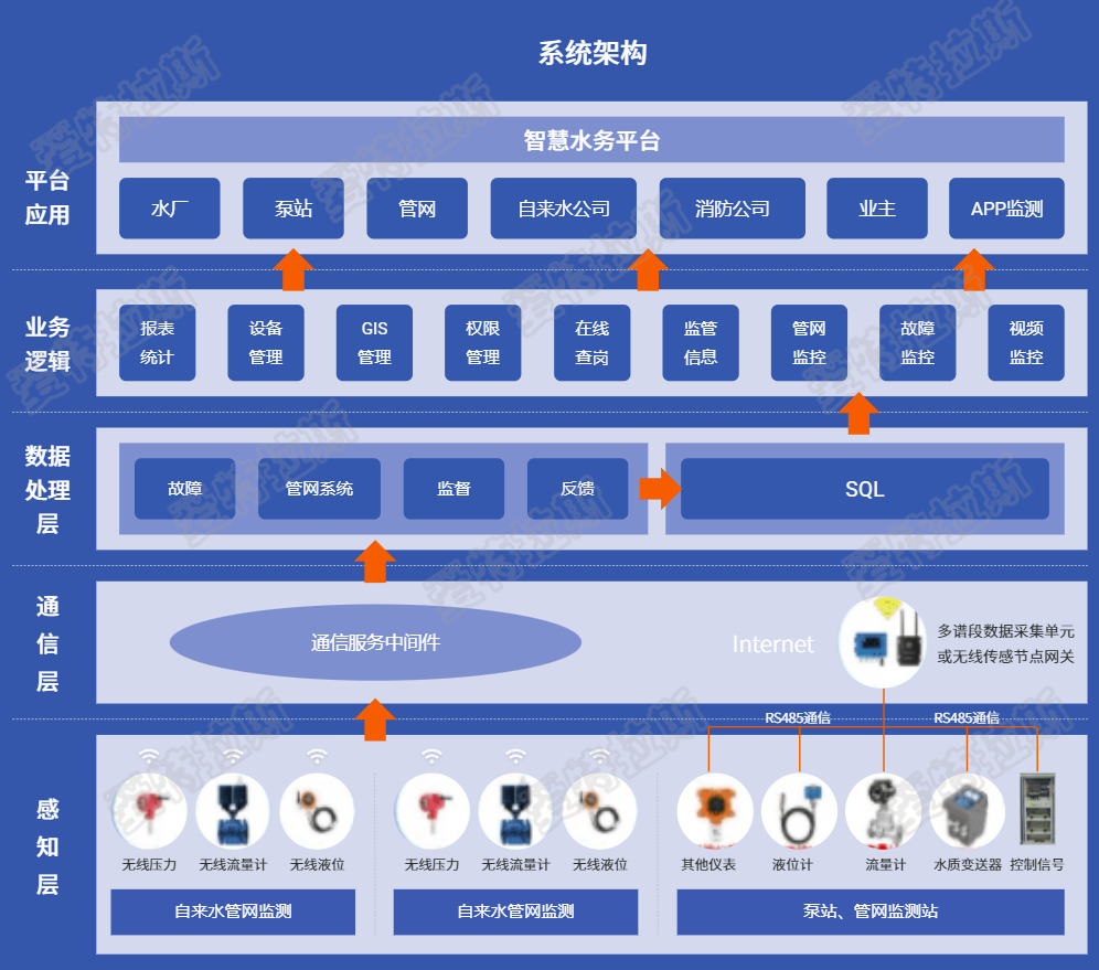 水利可視化監(jiān)測(cè)系統(tǒng)系統(tǒng)通過數(shù)采儀、無線網(wǎng)絡(luò)、水質(zhì)水壓表、液位監(jiān)測(cè)儀等在線監(jiān)測(cè)設(shè)備實(shí)時(shí)感知城市供排水系統(tǒng)的運(yùn)行狀態(tài),并采用可視化的方式有機(jī)整合水務(wù)管理部門與供排水設(shè)施,形成“城市水務(wù)物聯(lián)網(wǎng)”,并可將海量水務(wù)信息進(jìn)行及時(shí)分析與處理,并作出相應(yīng)的處理結(jié)果輔助決策建議,以更加精細(xì)和動(dòng)態(tài)的方式管理水務(wù)系統(tǒng)的整個(gè)生產(chǎn)、管理和服務(wù)流程,從而達(dá)到“智慧”監(jiān)測(cè)的目的。