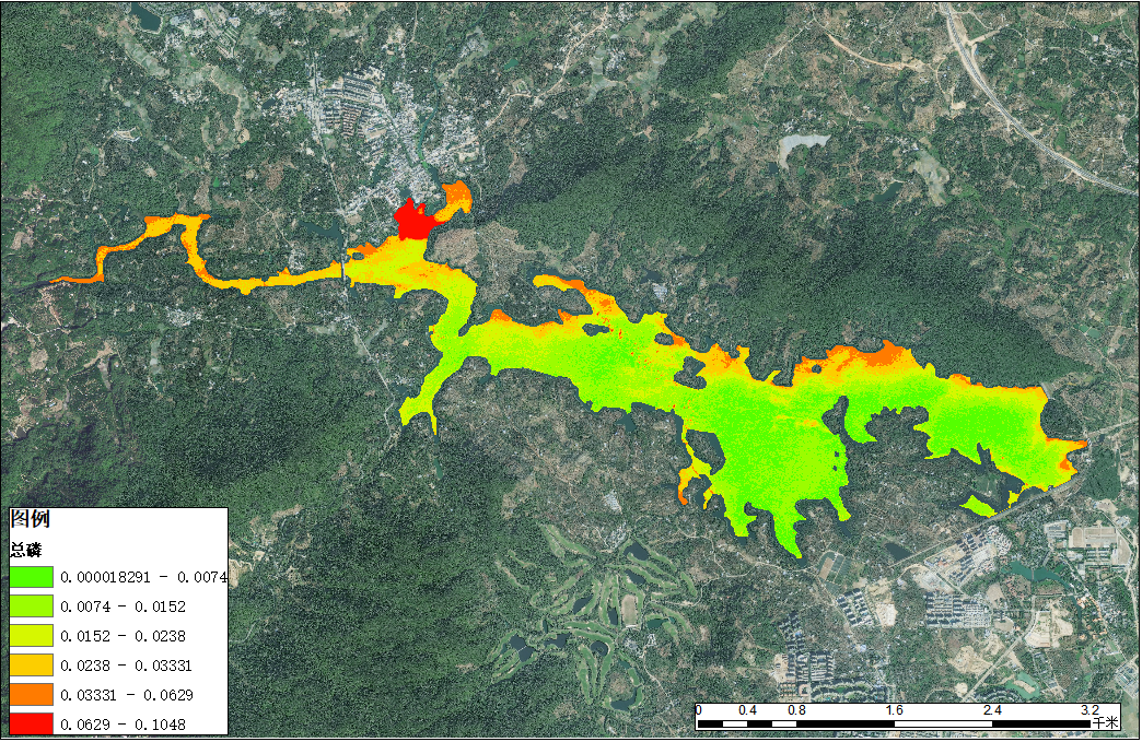 輸入經(jīng)過(guò)預(yù)處理的多光譜影像數(shù)據(jù)及模型確定步驟生成的模型,進(jìn)行遙感數(shù)據(jù)反演,最終得到單因子水質(zhì)反演成果。