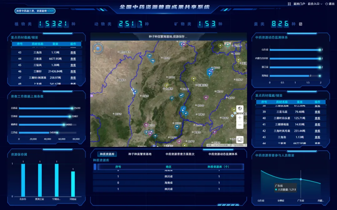 普查成果共享系統(tǒng)上線后,其強(qiáng)大的數(shù)據(jù)查詢、瀏覽、匯總分析及可視化展示功能令人眼前一亮。通過地圖、餅圖、柱狀圖、表格等多種直觀形式,系統(tǒng)從多維度、全方位地呈現(xiàn)了中藥資源普查的豐富成果,使數(shù)據(jù)生動(dòng)鮮活,易于理解與利用。